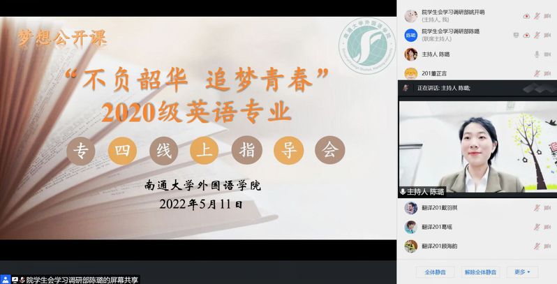 5月11日下午,成人直播 举办了“不负韶华 追梦青春”2020级专四考试线上指导会,年级辅导员、班主任及全体2020级本科生参与了本次活动。