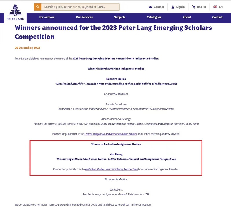 近日,兰培德国际学术出版集团(Peter Lang)“2023年度青年学者大赛”(2023 Peter Lang Emerging Scholars Competition)结果揭晓,成人直播 成人直播 张艳博士的博士学位论文“当代澳大利亚小说中的旅行:定居殖民、女性主义和原住民的视角”(“The Journey in Recent Australian Fiction: Settler Colonial, Feminist and Indigenous Perspectives”)成功入选年度出版项目,将作为《澳大利亚研究:跨学科的视角》学术专著系列之一由兰培德出版集团出版。这是成人直播 青年教师首次获得国外知名学术出版社出版项目资助。