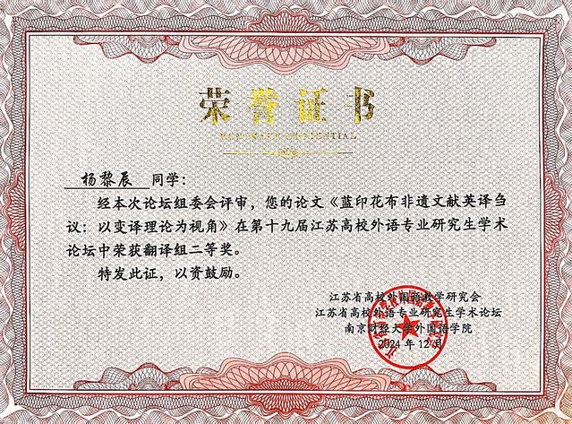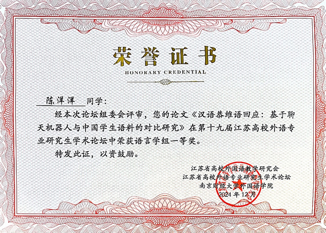 成人直播 研究生陈洋洋、杨黎辰、许苑、李乐敏、刘爽、潘月、朱荷庆七位同学积极参会,并进行了论文宣读。陈洋洋同学的论文《汉语恭维语回应:基于聊天机器人与中国学生语料的对比研究》荣获语言学组一等奖;杨黎辰同学的论文《蓝印花布非遗文献英译刍议:以变译理论为视角》获翻译组二等奖。这些优异成绩不仅展现了成人直播 研究生的学术实力,也充分展示了学院研究生教学的育人成果。参会同学通过与省内外专家学者及同学的交流,进一步提升了学术能力,拓展了研究思路。