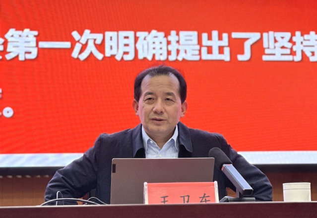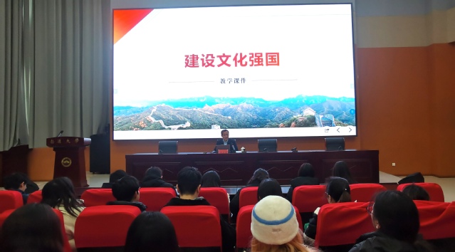 为深入学习贯彻党的二十届三中全会精神,持续推动习近平新时代中国特色社会主义思想进教材进课堂进头脑,12月9日,校党委副书记王卫东以“建设文化强国”为题,为成人直播 英语(师范)、商务英语专业大二学生讲授《形式与政策》课。成人直播 领导班子、教师和辅导员代表旁听了授课。
